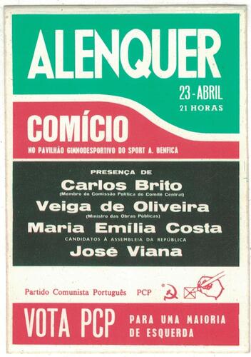 • Autocolante - Vota PCP Para Uma Maioria de Esquerda - Alenquer - Comício no Pavilhão Gimnodesportivo do Sport A. Benfica